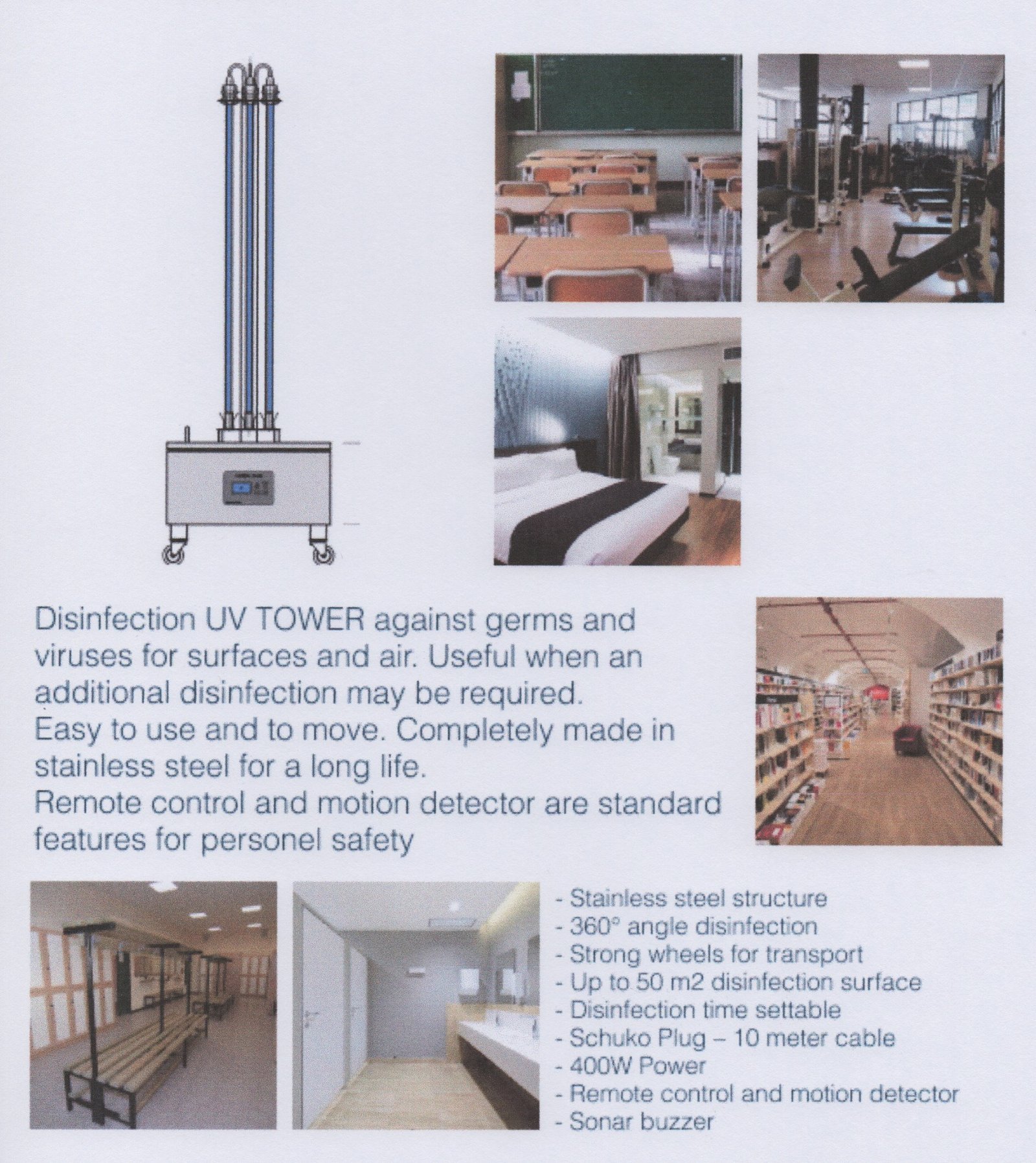 Το UV TOWER απολυμαίνει τον αέρα και τις επιφάνειες από μικρόβια και ιούς.