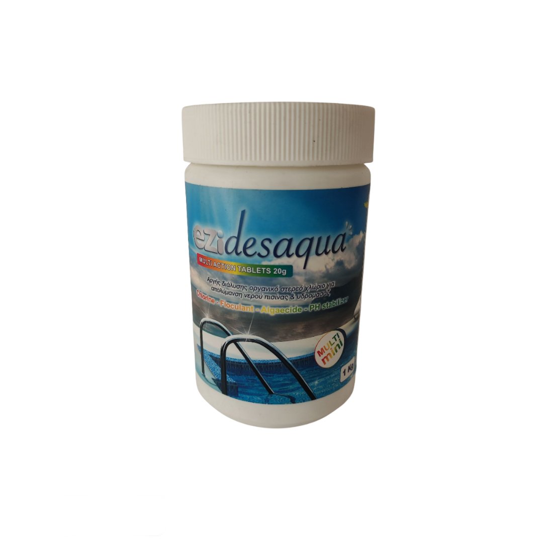 Συντήρηση πισίνας Multiaction tablets 20γρ. αργής διάλυσης με 4 συστατικά (χλώριο, κροκιδωτικό,αλγειοκτονο-σταθεροποιητη ph)με έγκριση Ε.Ο.Φ συσκευασία 1Kg .